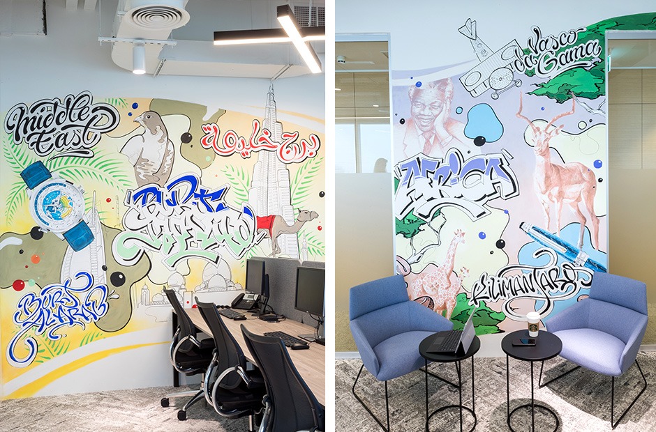 L’équipe Montblanc Middle East est de loin l’équipe avec laquelle nous avons tissé des liens les plus forts et nous avons été très heureux lorsque la seule et l’unique « Izzy » (que nous saluons au passage) nous a contacter pour travailler sur une fresque murale dans les bureaux de Montblanc à Dubaï, alors en pleine rénovation. En partie grâce au travail des talentueuses Isabelle et Anna, l’espace a été complètement revisité, dans un esprit plus moderne et en phase avec le mode de travail actuel. Plus ouvert, décontracté, un peu dans l’esprit des espaces de travail des start up californiennes ou des espaces de coworking. Un genre d’état d’esprit où le graffiti trouve sa place tout naturellement, apportant un peu plus de vie et de couleurs sur les murs. (On parle beaucoup de cet élan de nouvelles décorations sur le blog : Par exemple le cas des bureaux Wework, La décoration d’escaliers d’entreprise …et plein d’autres articles très intéressants ).