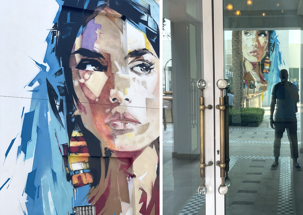 L’un de nos artistes a ainsi réalisé une fresque monumentale au sein du resort, à proximité du restaurant japonais. L’œuvre s’articule autour d’un portrait multicolore, enrichi de zones plus abstraites, créant un dialogue entre figuration et expression contemporaine.