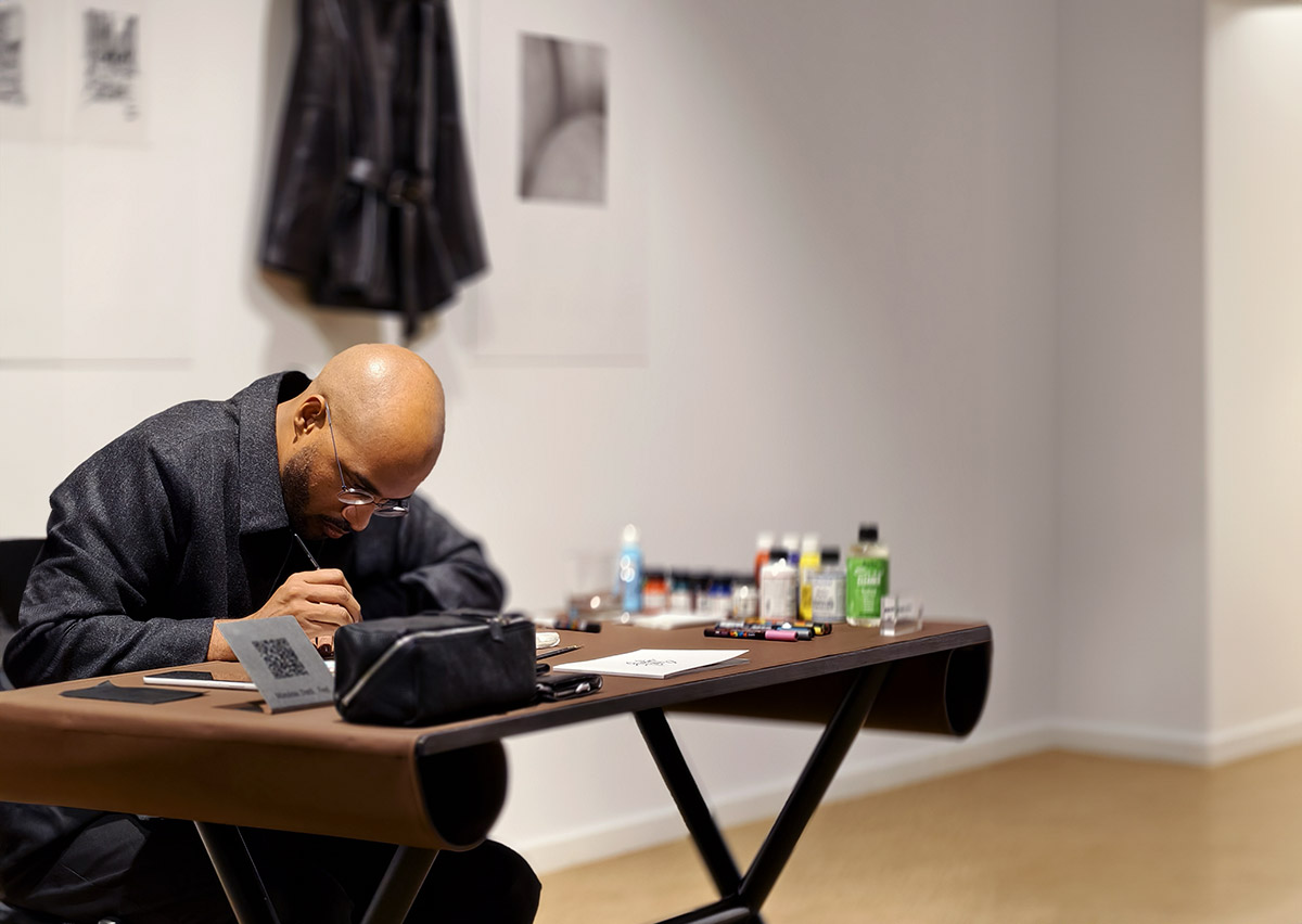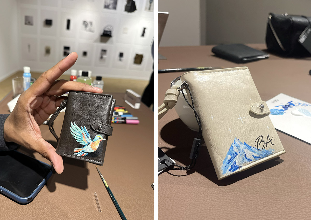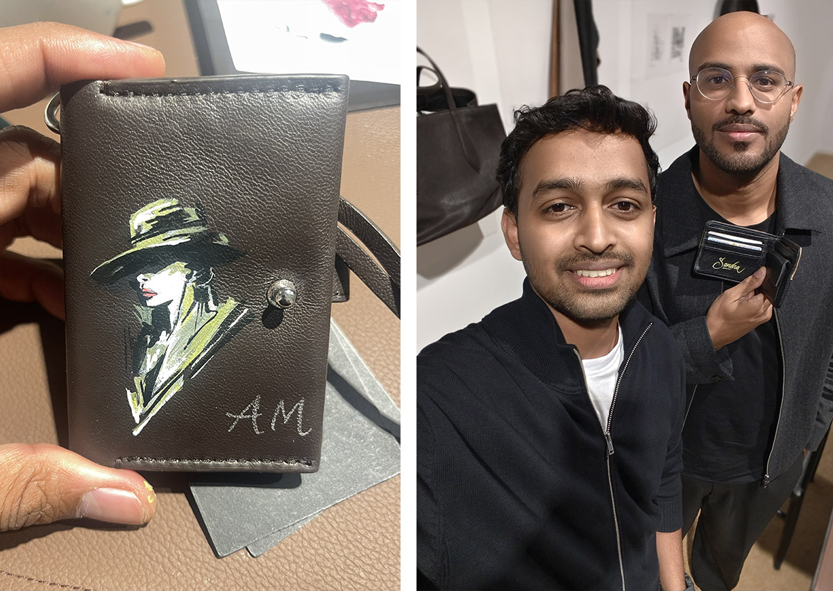 Au centre de cette expérience, notre artiste a proposé une personnalisation sur cuir en direct, en créant des pièces uniques sur des porte-cartes en cuir signés Massimo Dutti. Chaque invité pouvait choisir un motif, une initiale ou une illustration réalisée à la main, donnant naissance à un objet exclusif. Cette rencontre entre l’artisanat et la mode a permis d’offrir aux visiteurs un moment d’échange privilégié, dans la continuité d’expériences sur mesure déjà réalisées pour Christian Dior ou Jimmy Choo.