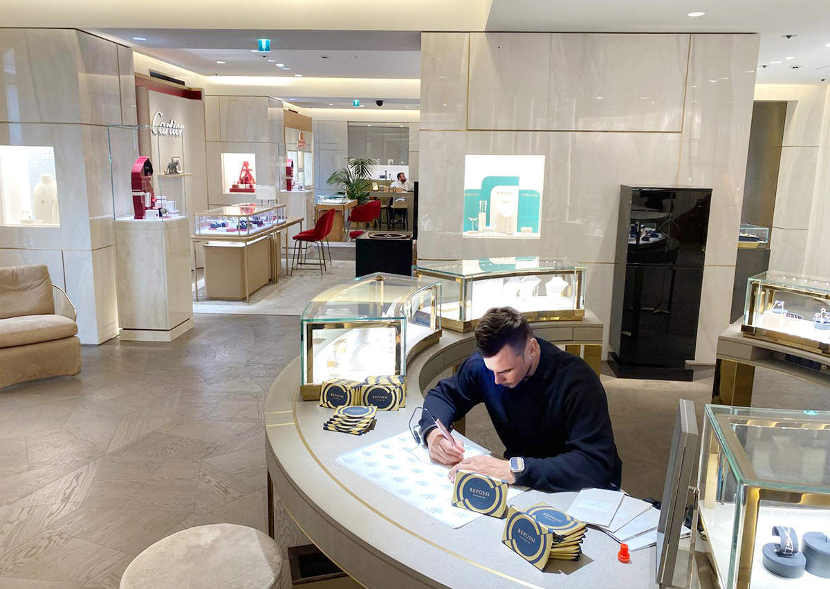 À l’occasion des fêtes de fin d’année, la maison de joaillerie Repossi, via l’un de ses partenaires retail, a fait appel à notre agence pour déployer une activation de personnalisation en boutique au cœur de Saint-Germain-des-Prés, à Paris. Ce type de projet s’inscrit dans un contexte spécifique : celui des grands magasins et espaces de distribution du luxe, où cohabitent plusieurs maisons au sein d’un même lieu.